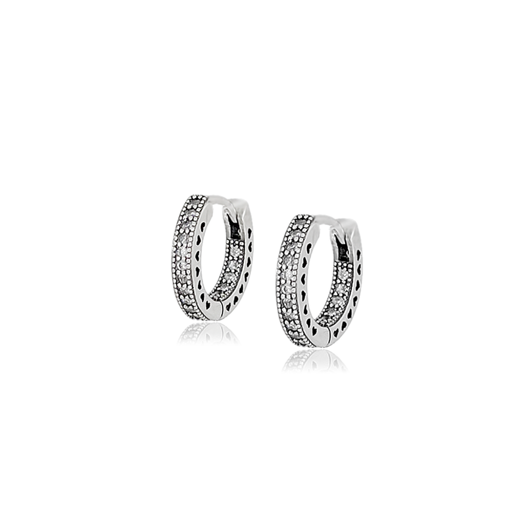 Brinco de argola pequeno em Prata 925 com zircônias e fecho click. Detalhes de corações vazados completam a joia, que é leve e sofisticada. Acessório clássico e versátil que pode ser usado em diferentes ocasiões, além de ser leve e não incomodar na orelha!