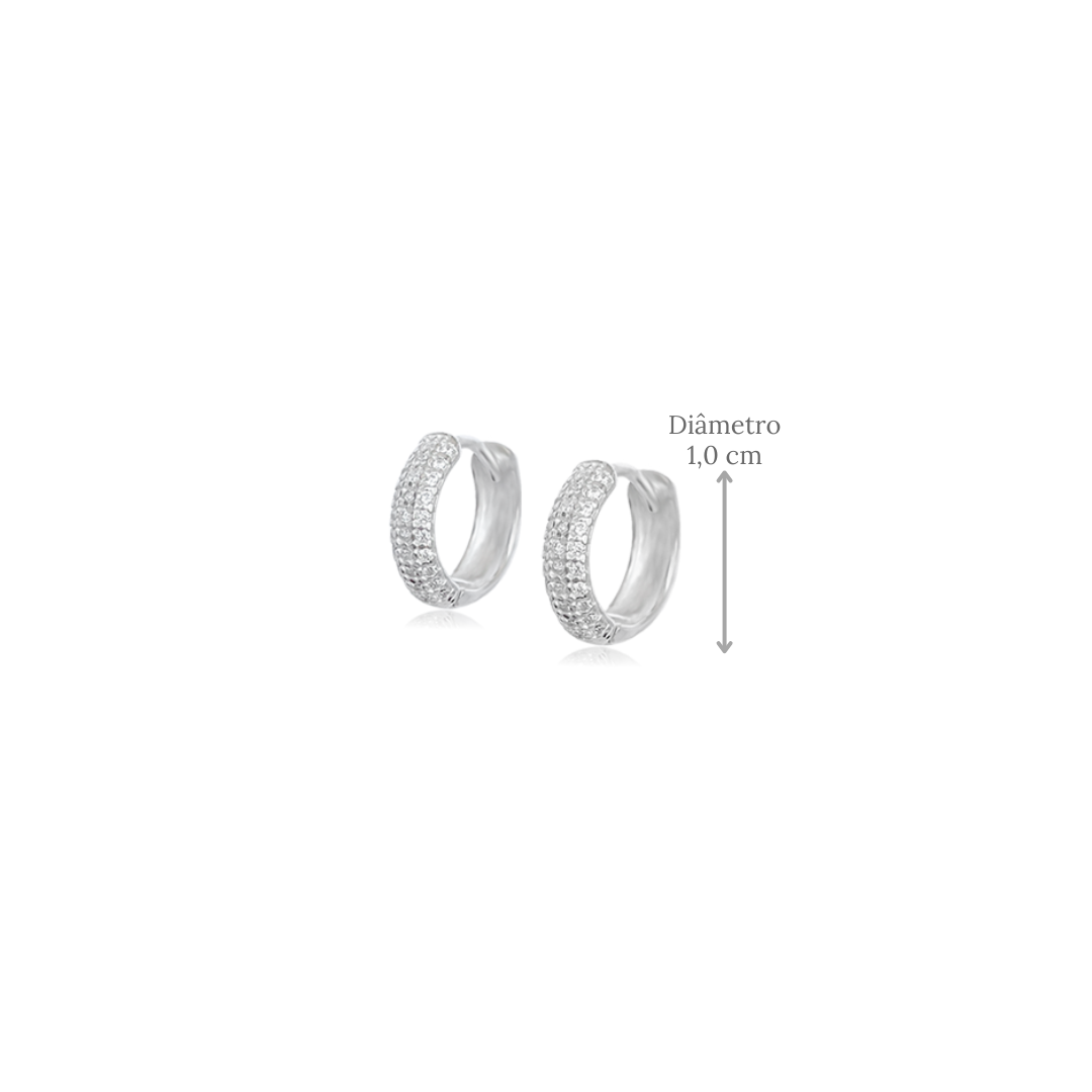 Brinco de argola delicado em prata 925, cravejado com três fileiras de zircônias, perfeito para adicionar brilho ao seu look. Com fecho tipo click, garante praticidade ao colocar e retirar. Compacto e versátil, é ideal para o primeiro, segundo ou terceiro furo, oferecendo conforto e leveza no uso diário. Um acessório encantador e discreto, pensado para quem valoriza sofisticação e estilo em qualquer ocasião.