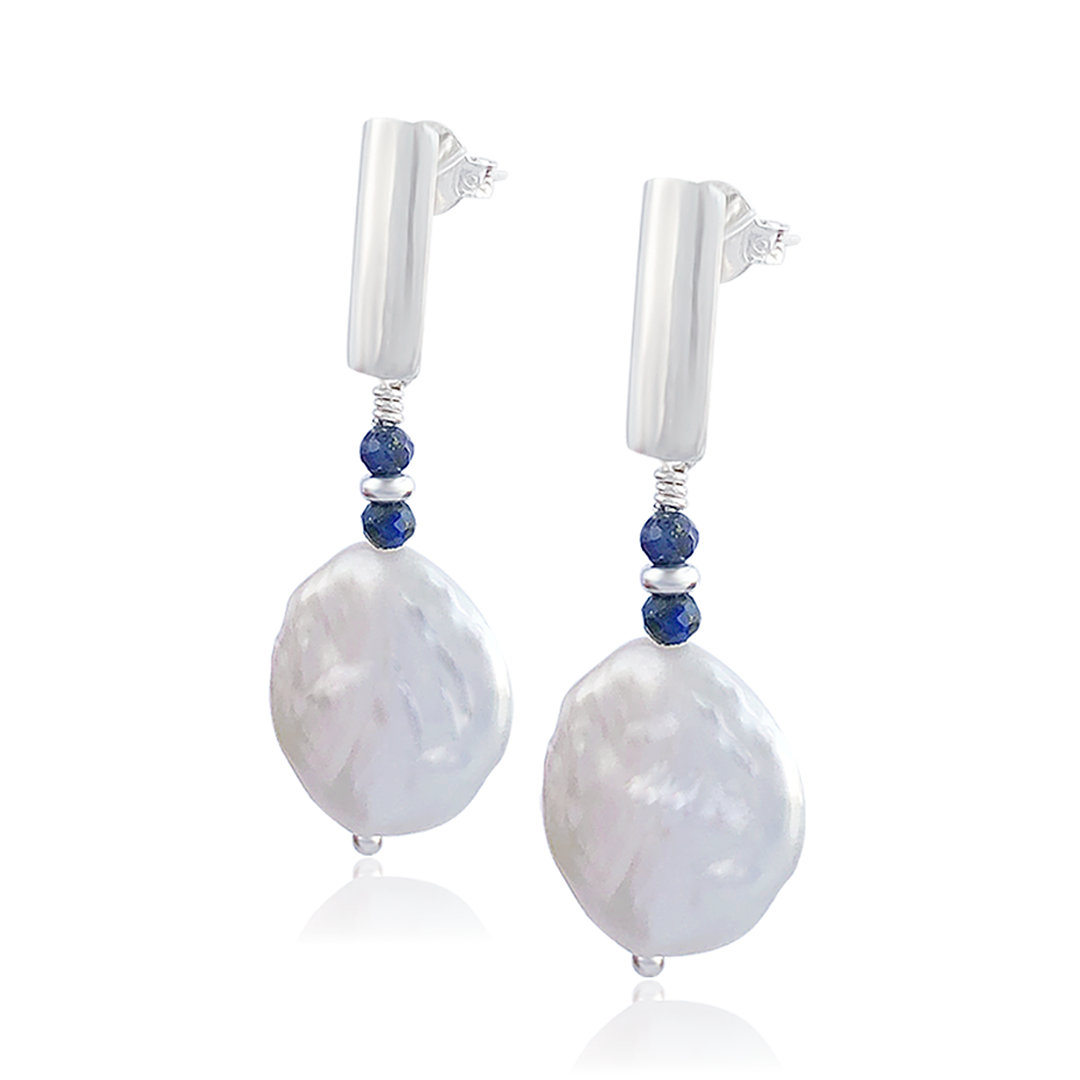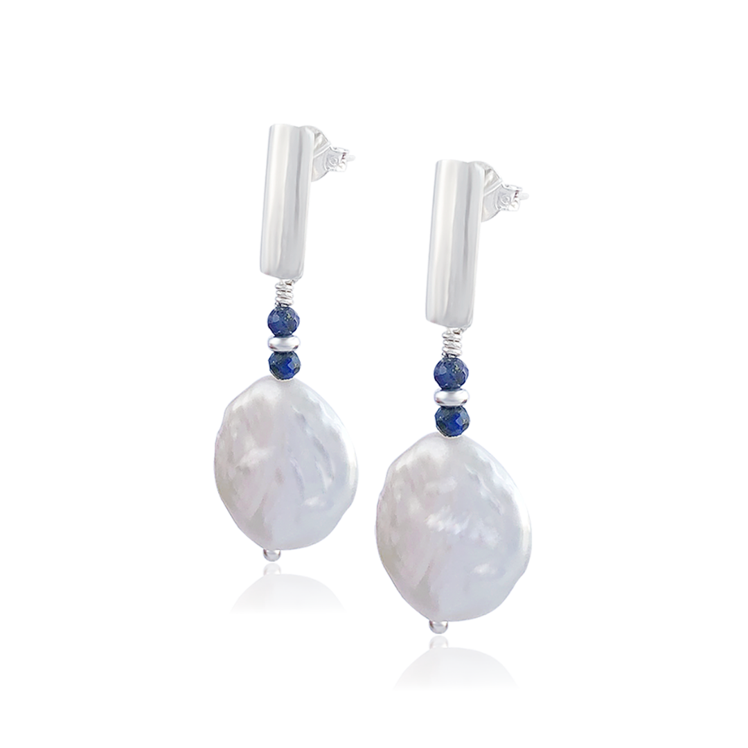 Este brinco pendente reflete uma elegância atemporal com sua exuberante pérola moeda (barroca) na ponta e duas delicadas pedras de lápis-lazúli. As pérolas simbolizam pureza, feminilidade, sabedoria e sorte, enquanto o lápis-lazúli é valorizado por sua conexão com a intuição, clareza na comunicação e proteção. Ideal para quem valoriza a beleza autêntica e deseja um acessório carregado de significado e simbolismo.