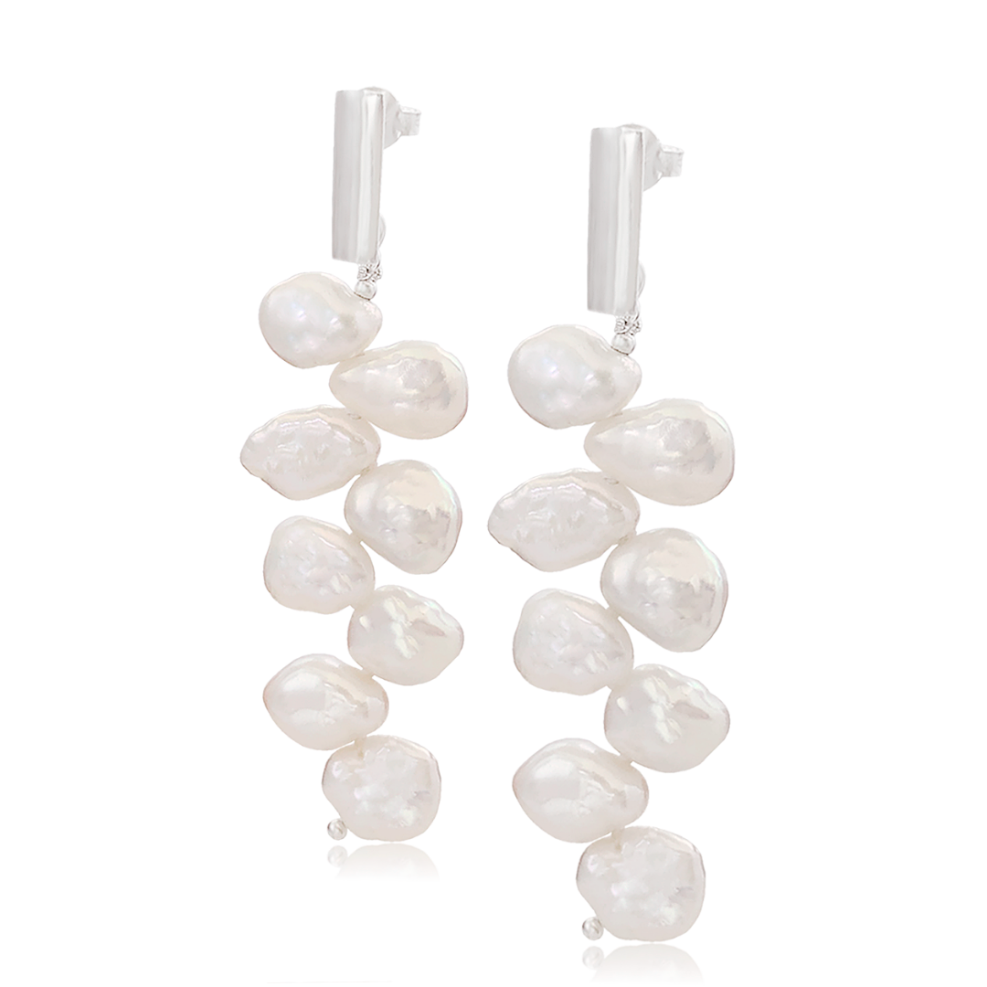 Luxuoso brinco pendente de pérolas barrocas intercaladas, uma verdadeira obra de arte que combina o encanto das pérolas naturais com o brilho da prata 925. Cada pérola barroca é única em sua forma e textura, simbolizando pureza, feminilidade, sabedoria, sorte, amor e transformação. Além de adicionar um toque de glamour e refinamento, este brinco eleva sua autoconfiança e estilo pessoal, garantindo elegância em qualquer ocasião.