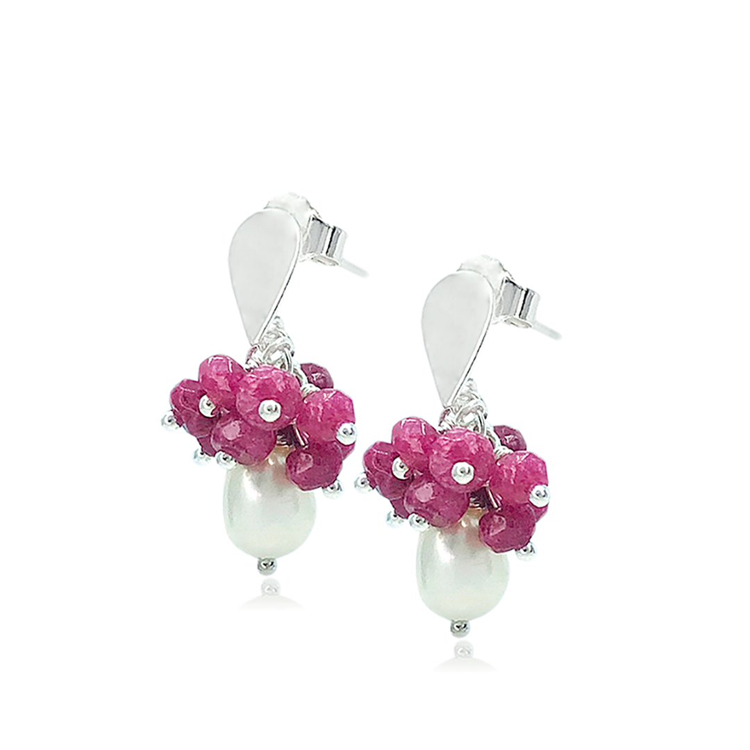 Este delicado par de brincos tipo cacho, com pérolas naturais e pedras de jade na cor fúcsia, possui uma base em formato de gota para um visual leve e romântico. As pérolas, valorizadas desde a antiguidade, simbolizam feminilidade, integridade e sabedoria, além de terem propriedades curativas que promovem calma e equilíbrio emocional. O jade, por sua vez, é um amuleto de proteção que afasta perigos, purifica as energias ao redor e atrai coisas positivas, simbolizando pureza, beleza e serenidade, além de acalmar a mente e dissipar pensamentos negativos.