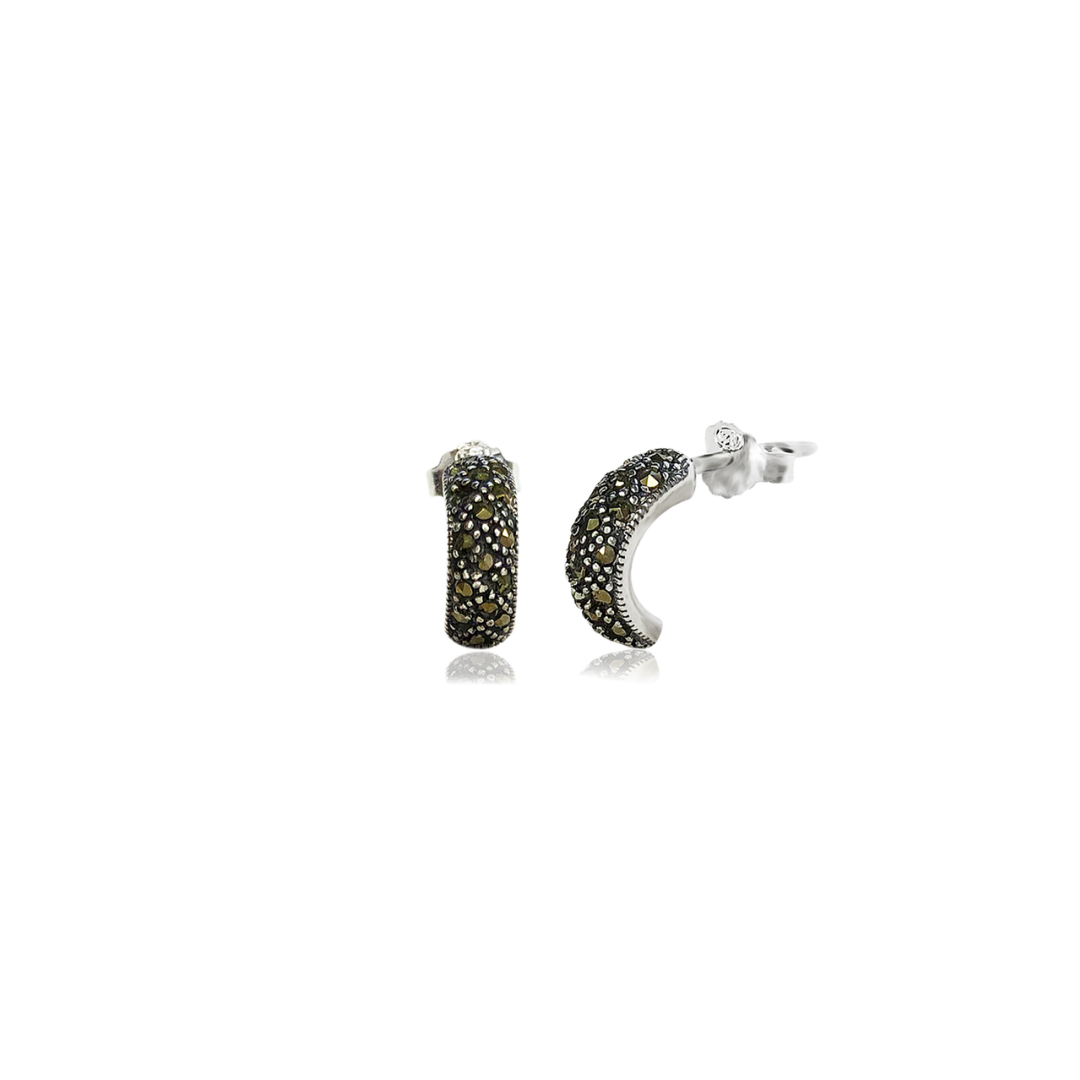 Brinco em prata 925 no estilo meia argola, com marcassitas e acabamento envelhecido. Este acessório pequeno e delicado oferece um brilho encantador das marcassitas, perfeito para complementar seu visual. Ele confere um charme especial à orelha, sendo leve e confortável para o uso diário.