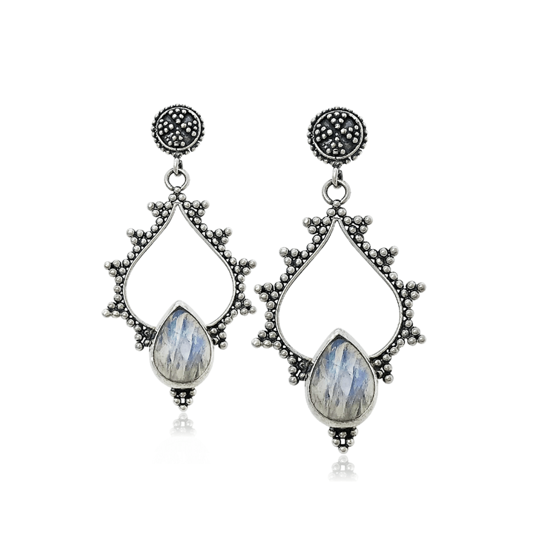 Brinco de prata com pedra da lua, acabamento envelhecido e tarraxa borboleta, resultando em um acessório encantador e cheio de charme. Perfeito para compor um visual elegante e marcante. A pedra da lua é uma gema mística, conhecida por seu alto poder espiritual e forte energia feminina. Suas vibrações espirituais aumentam a intuição, expandem a mente e intensificam nosso poder de atração e magnetismo pessoal.
