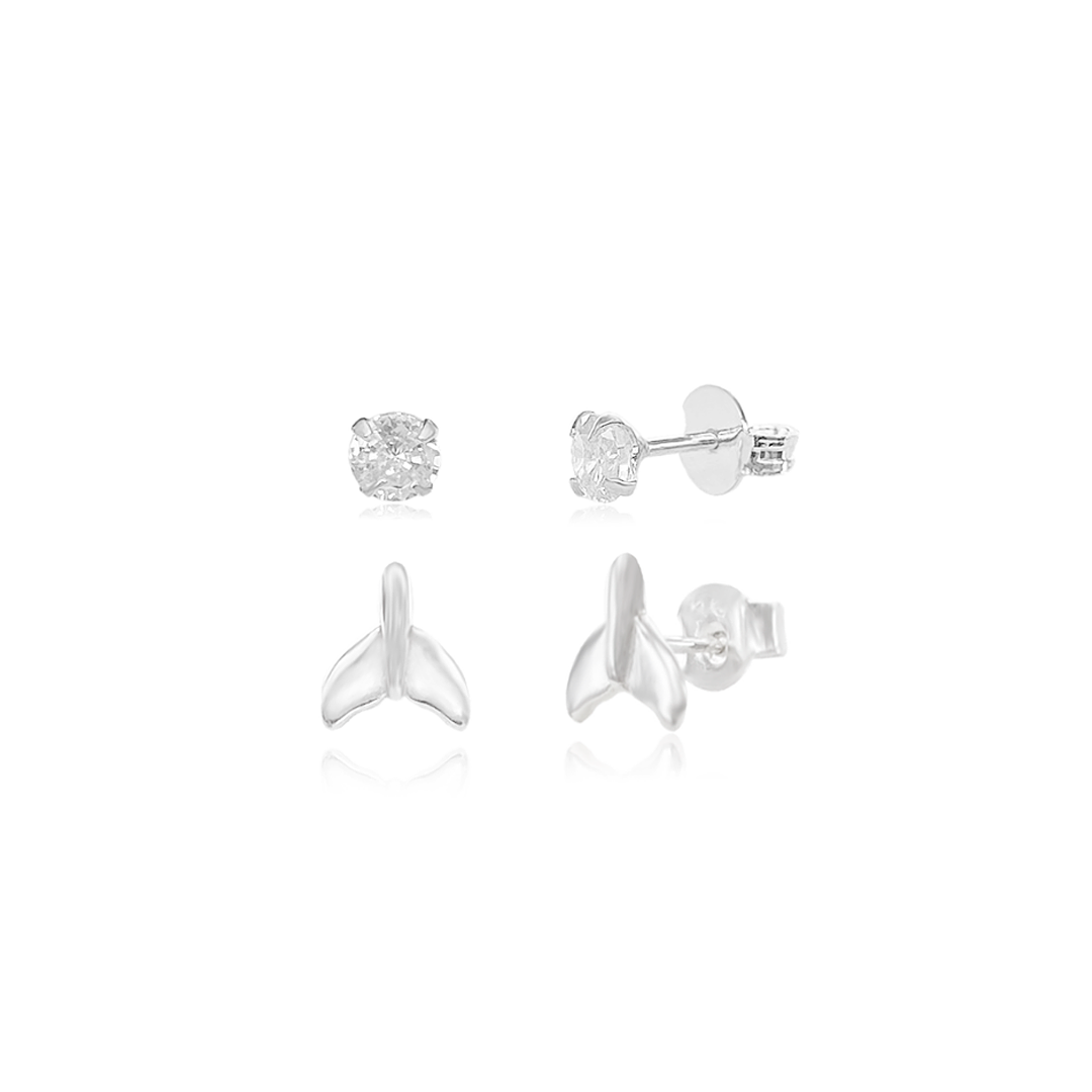 Kit com dois pares de brincos em prata 925, ponto de luz e cauda de sereia. Versáteis e elegantes, podem ser usados no primeiro e segundo furo ou no segundo e terceiro furo, adicionando um toque de delicadeza ao seu estilo. Feitos para quem busca sofisticação e versatilidade em acessórios, esses brincos são perfeitos para uso diário ou para ocasiões especiais. Experimente combiná-los com outros acessórios para criar combinações encantadoras e arrase em qualquer ocasião.
